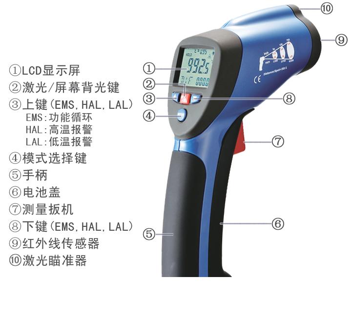 分辨率:小于2000°为0.1℃/℉,大于2000°为1℃/℉ 基本度:±1.5% 测温量程:-50~1350℃(-58~2462℉) 光学比率:16:1 安全标准:符合欧洲CE安全规范 响应时间:小于1秒 光谱响应:8~14um 发射率:可调整从 0.10 到 1.0 出量程提示:LCD 将显示 “-0L”,“0L” 性显示:自动 (正无显示); (-) 表明负 二管激光器:输出 <1mW,波长 630~670nm,Class 2(II)等 操作温度:0 ~ 50℃(32~ 122℉) 存储温度:–20~ 60℃ (-4 ~ 140℉) 相对湿度:10%~90%RH (操作), <80%RH (存储) 电源:9V 电池, NEDA 1604A 或 IEC 6LR61, 或其他同规格电池 尺寸:100 x 56 x 230mm 重量:290g 注意: 1.给出的示值允许误差条件,18~28℃(64~82℉),小于80%RH。 2.视场:确保被测物体大于仪器的光点直径,目标越小就应越靠近。当度很重要时,应确保被测物体不小于测点的两倍。 【产品结构】